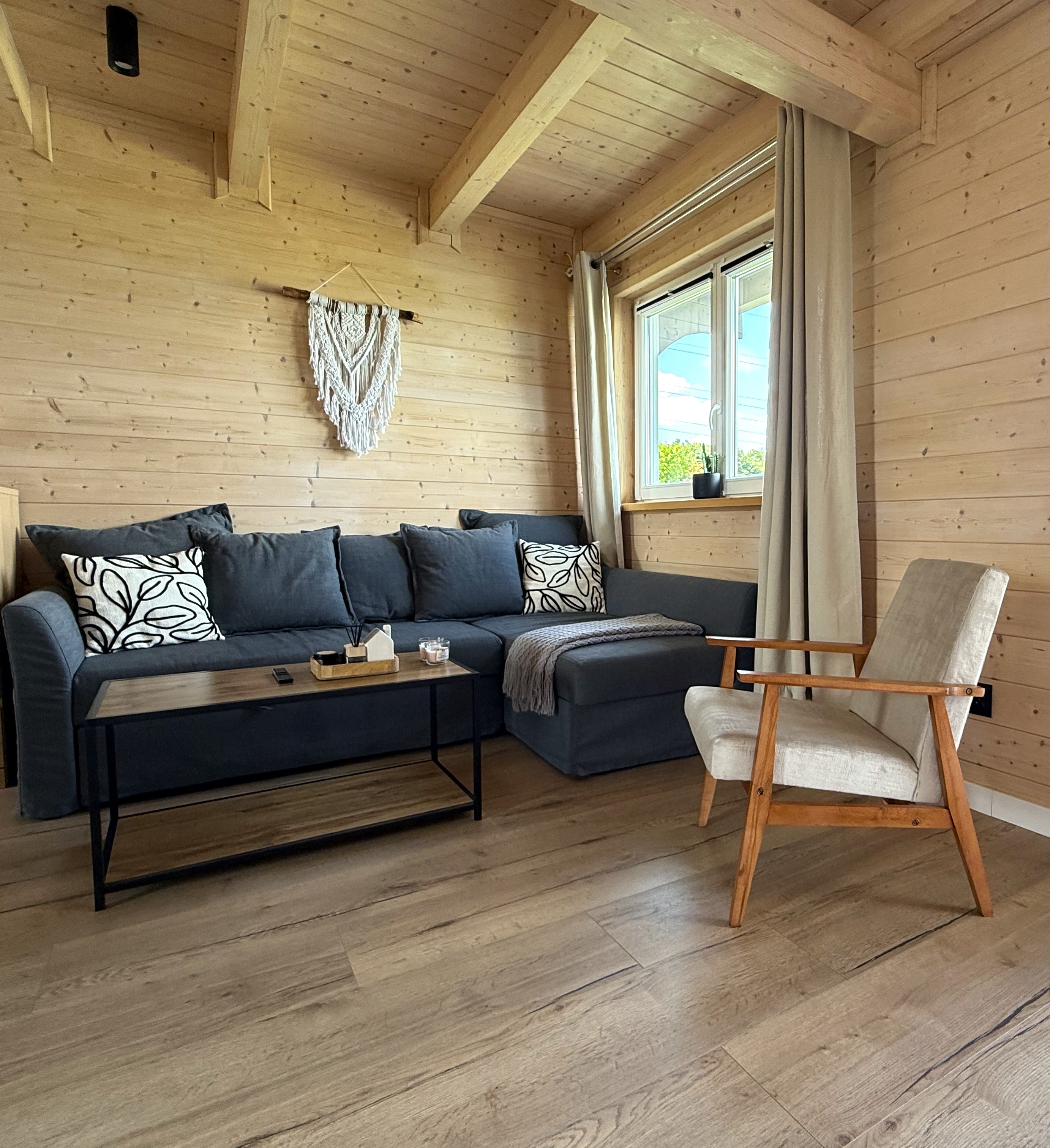Przestronny i jasny salon to idealne miejsce na relaks po dniu pełnym wrażeń. Wygodna, duża sofa narożna w neutralnym kolorze z ozdobnymi poduszkami zachęca do odpoczynku przy ulubionym filmie na płaskim telewizorze. Obok znajduje się fotel w stylu skandynawskim oraz stolik kawowy. Całość dopełniają drewniane ściany i sufit, które nadają wnętrzu ciepły i naturalny charakter. Z salonu prowadzi również wyjście na taras.