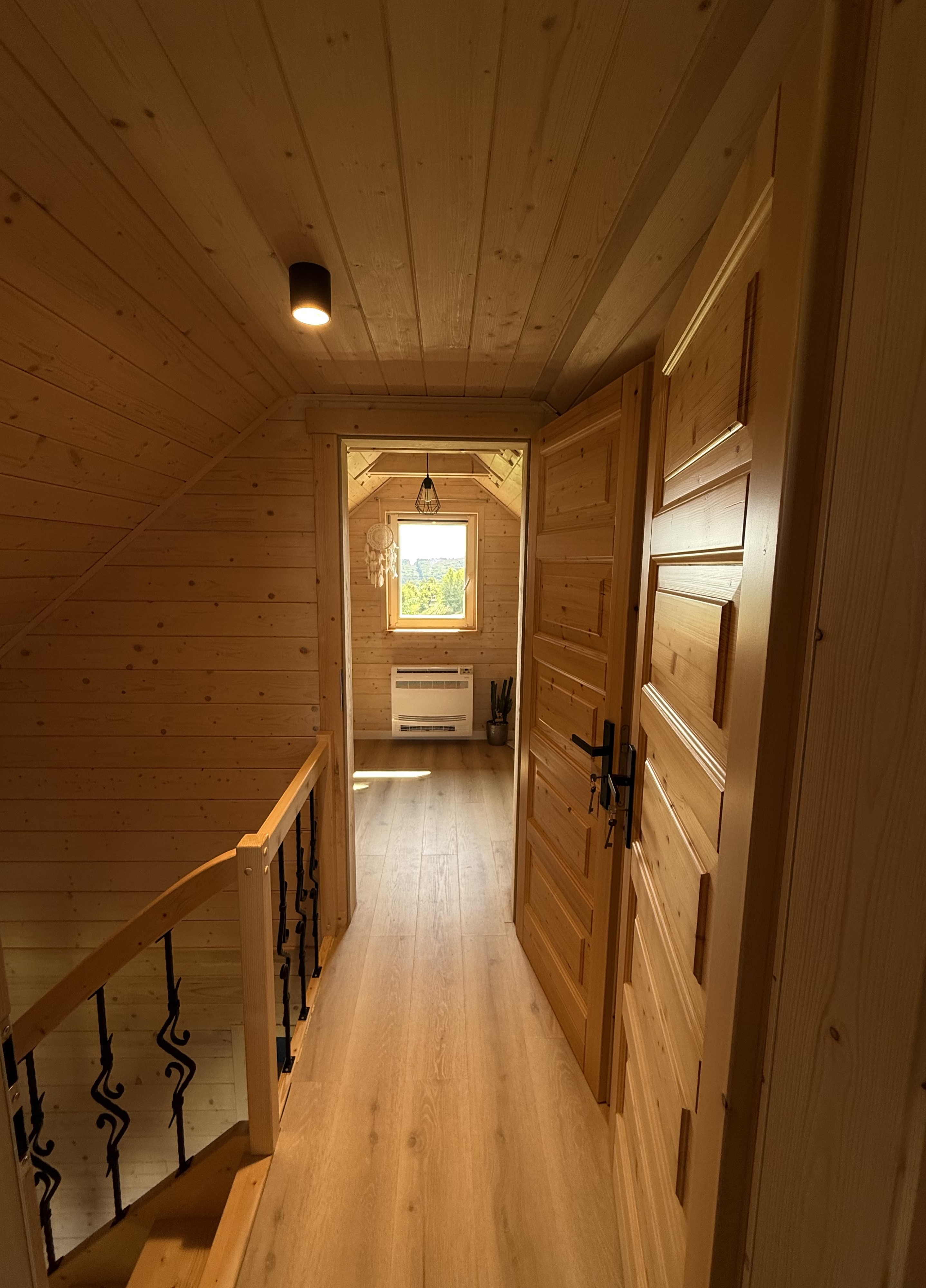Na piętrze czeka na Państwa przytulna sypialnia główna, zaprojektowana z myślą o maksymalnym komforcie. Przestronne łóżko z miękkim wezgłowiem gwarantuje spokojny sen. Urocze okno balkonowe oferuje piękny widok na okolicę, a drewniane belki sufitowe dodają wnętrzu rustykalnego uroku. To idealne miejsce na poranną kawę z widokiem na wschód słońca.